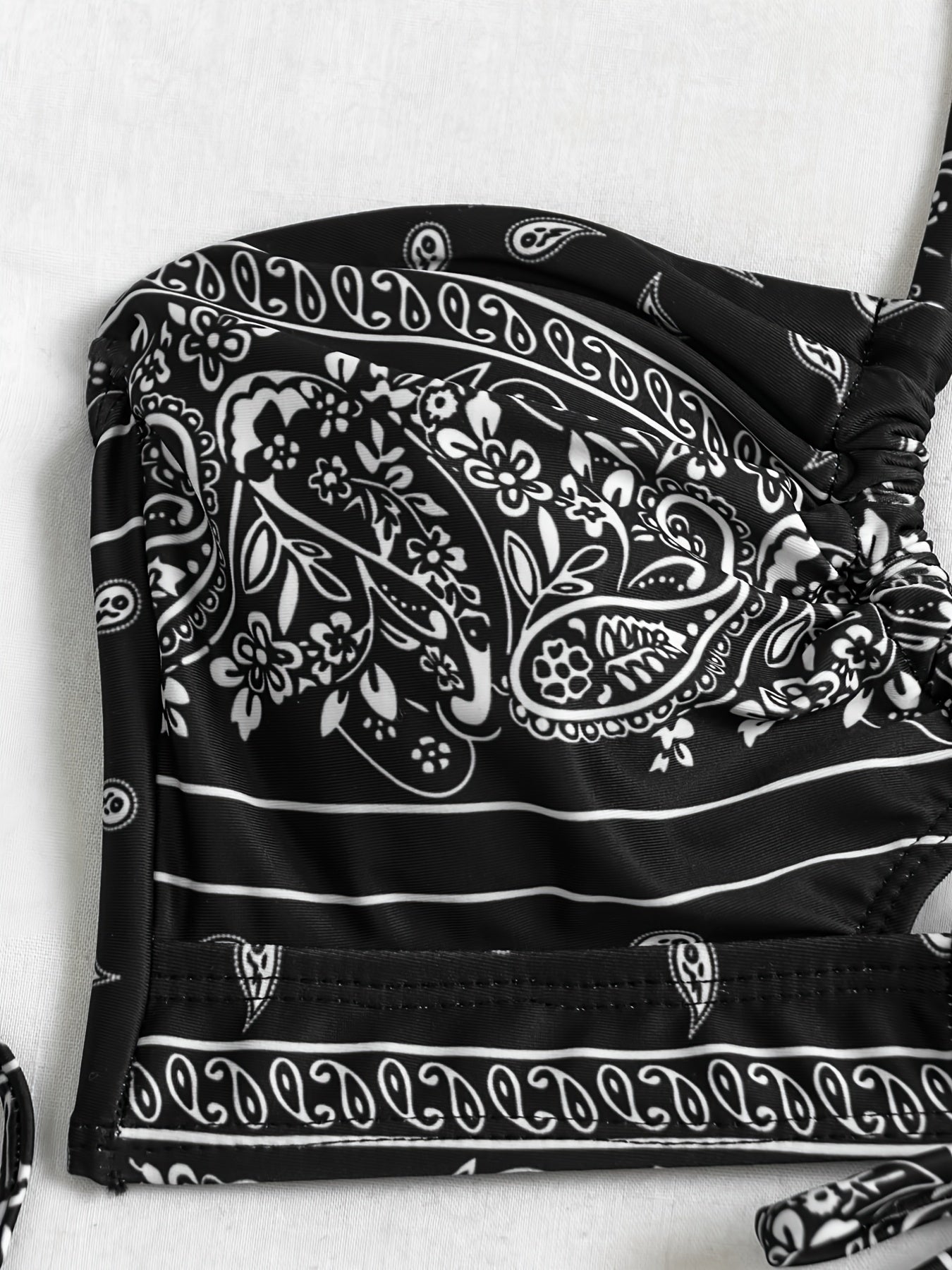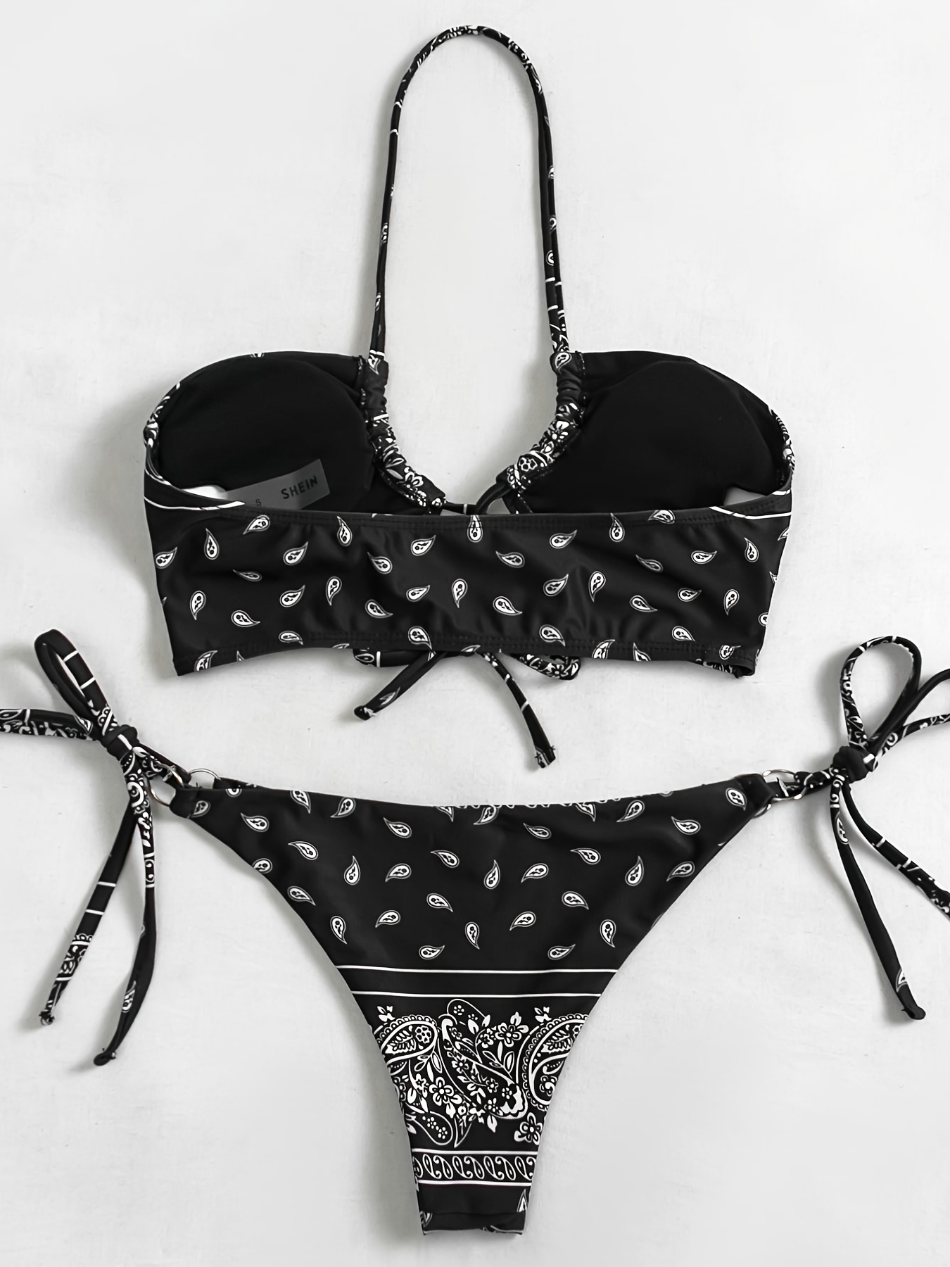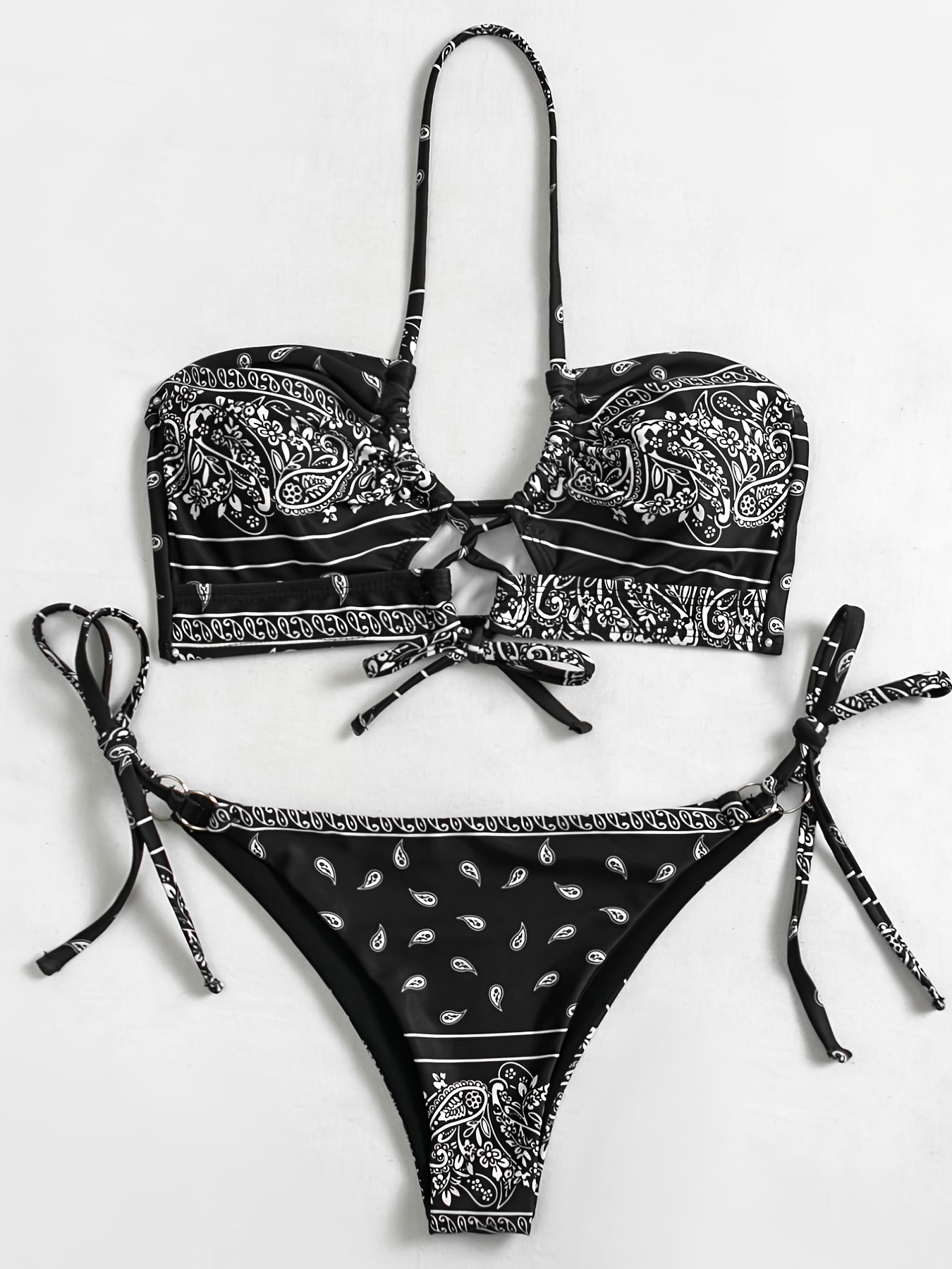 All Over Print Tie Centre Core Halter Neck Tie Side High Cut Ring-linked Black Color Base Two Piece Bikini Sets Swimsuit