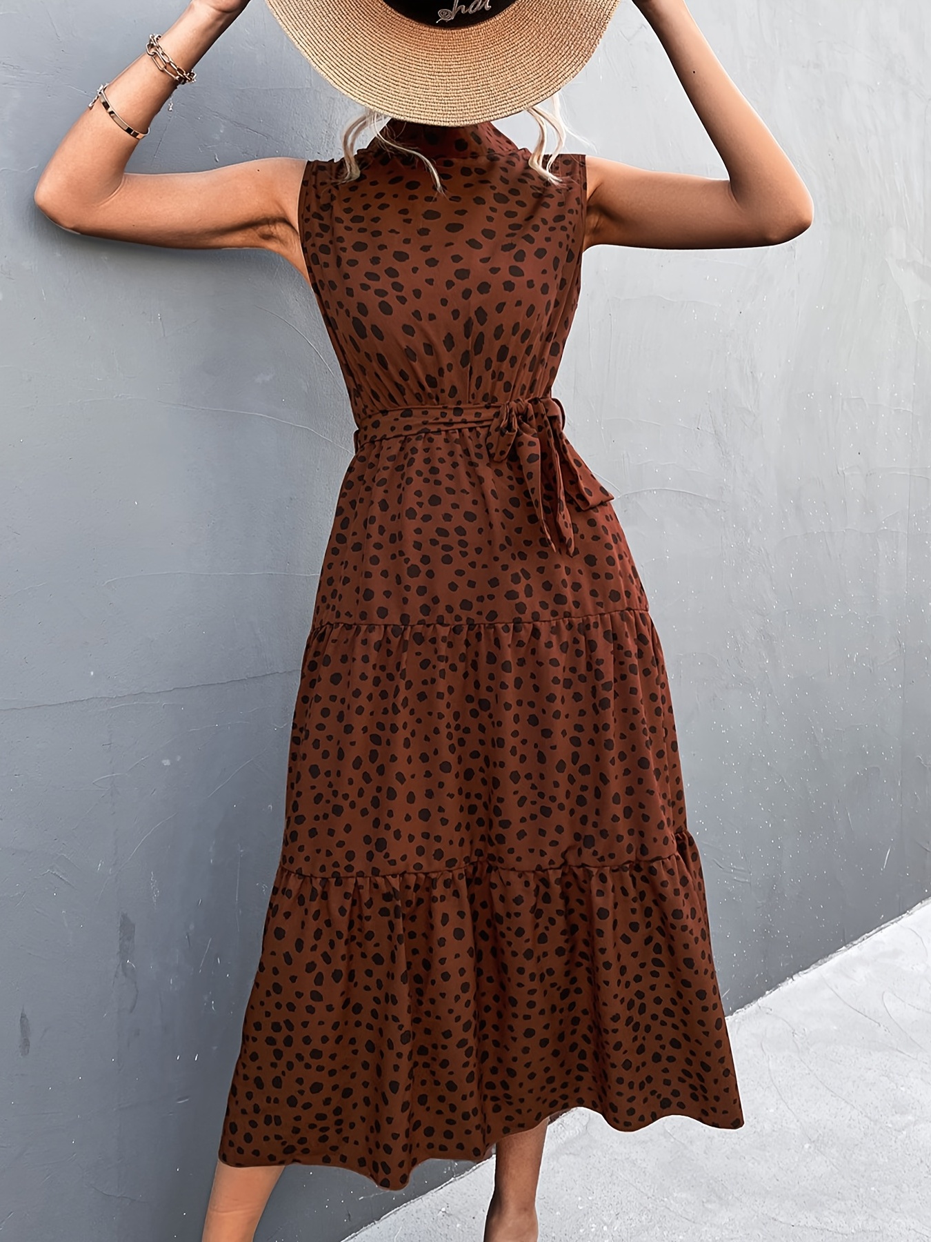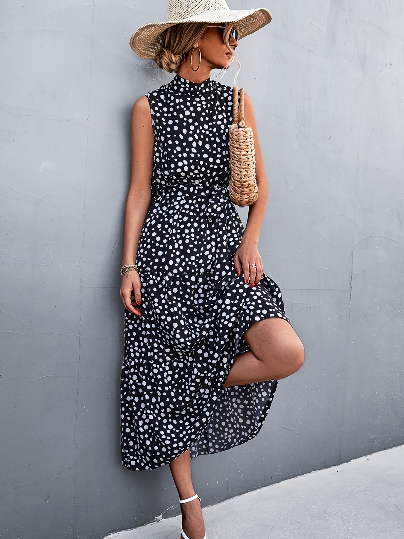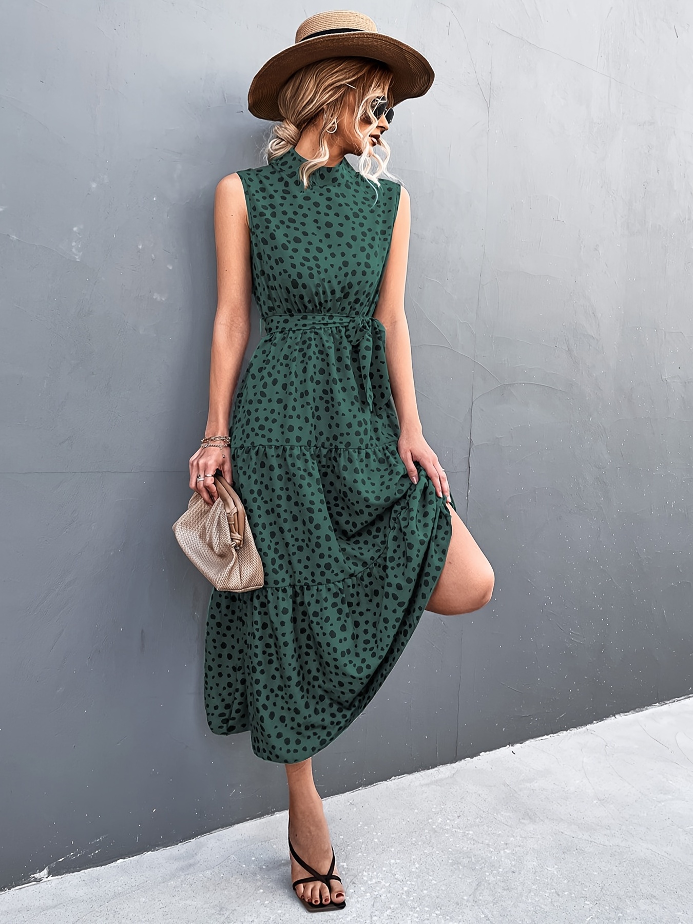 Elegant Lace Up Midi Dress Dot Tie Print Sleeveless High Neck Belt Waist Summer Maxi Dresses