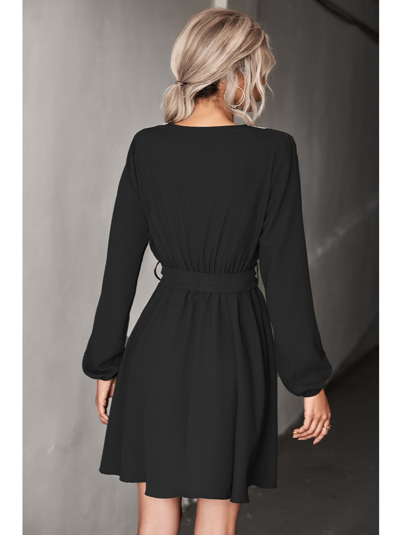 Elegant V-neck Casual Loose Solid Lace Long Sleeve Fashion Waist Belt Dresses