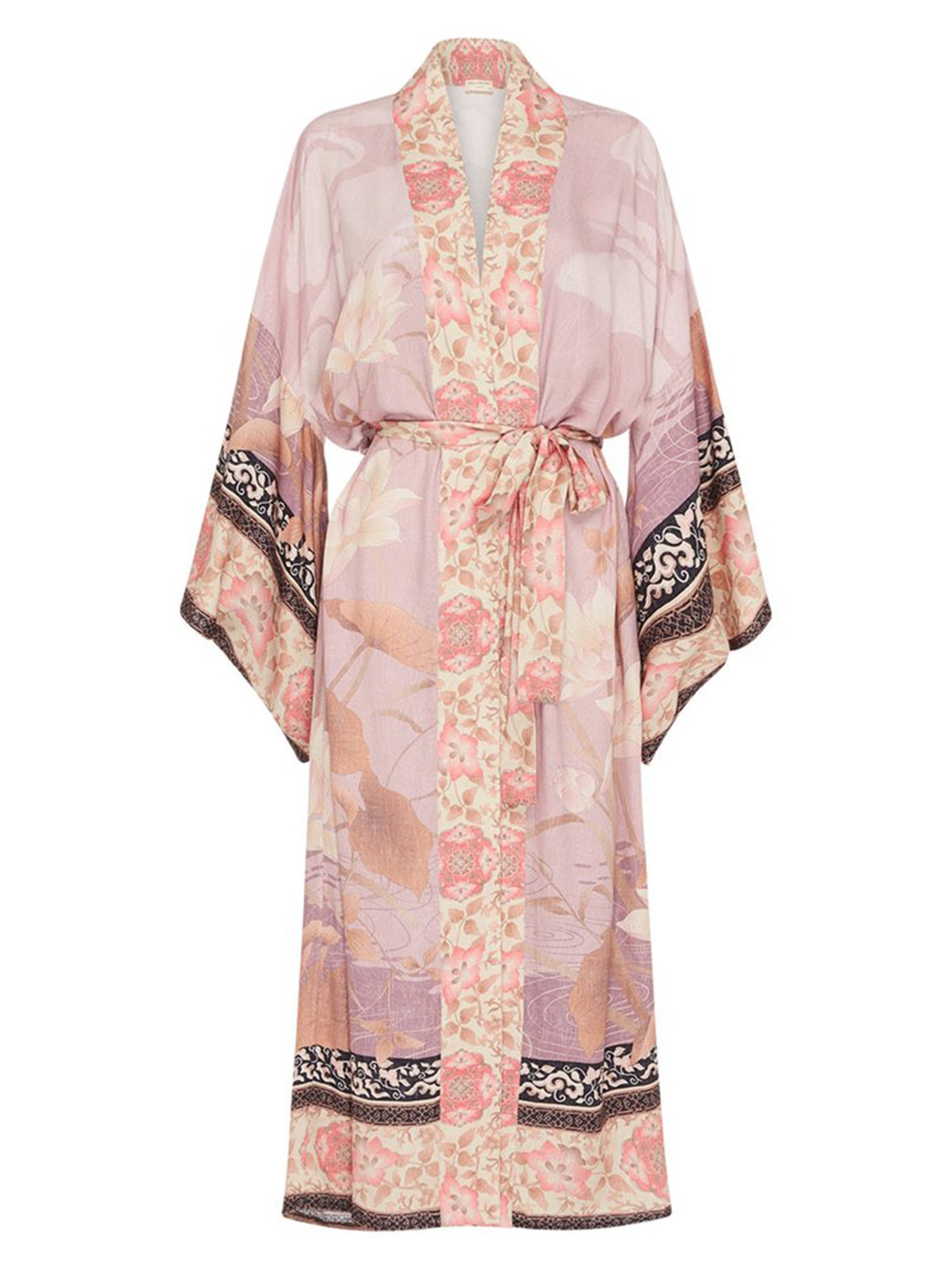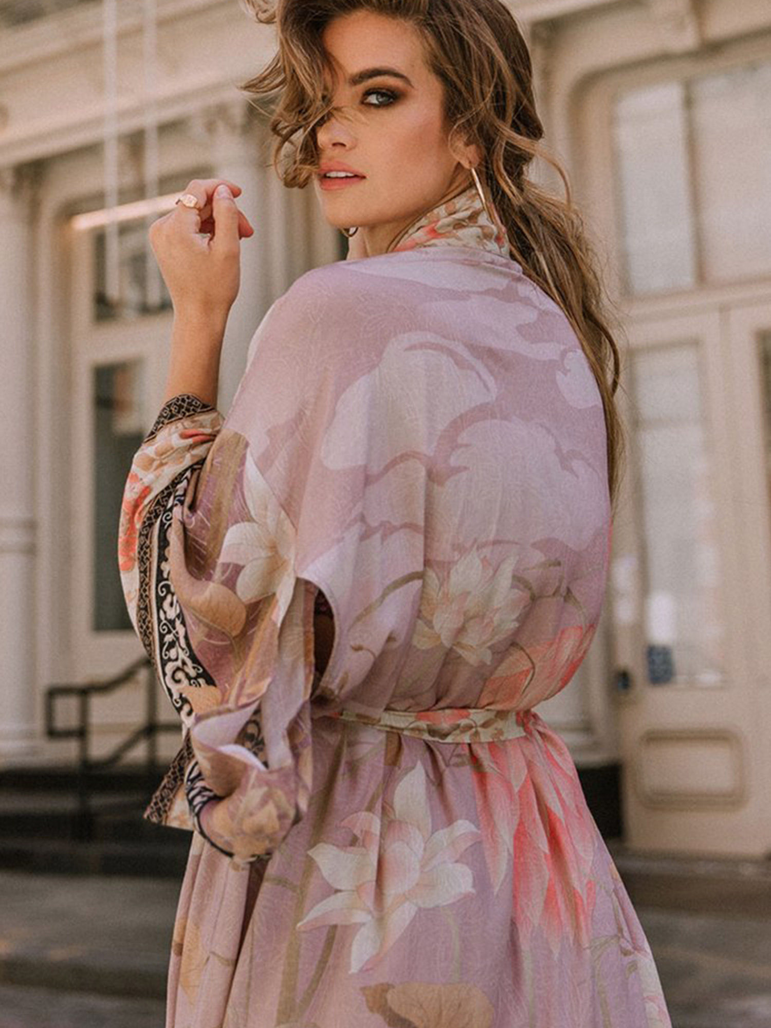 Ethnic Tribal Pattern Contrast Trim Long Robe Loose Baggy Fit Colorful Cover Up Kimono Shirts