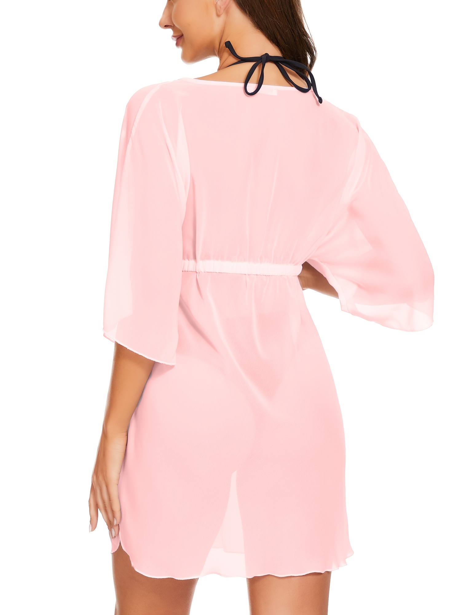 Sheer Drawstring Low Bust Cover Up Shirt Thigh Length Mid Sleeves Loose Fit Beachwear Cover Up Dress